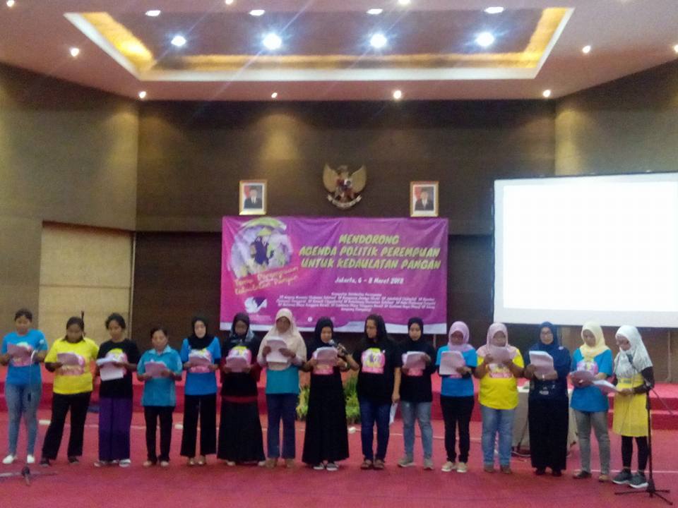 Untuk menyikapi situasi ini, 130 perempuan pejuang kedaulatan pangan yang berasal dari Aceh, Palembang, Lampung, Jakarta dan Kepulauan Seribu, Yogyakarta, Pati, Sumbawa, Mataram, Kendari, Makassar dan Takalar, Poso, Palu, Samarinda, Kapuas berkumpul di Hari Perempuan Sedunia menegaskan hal-hal sebagai berikut: