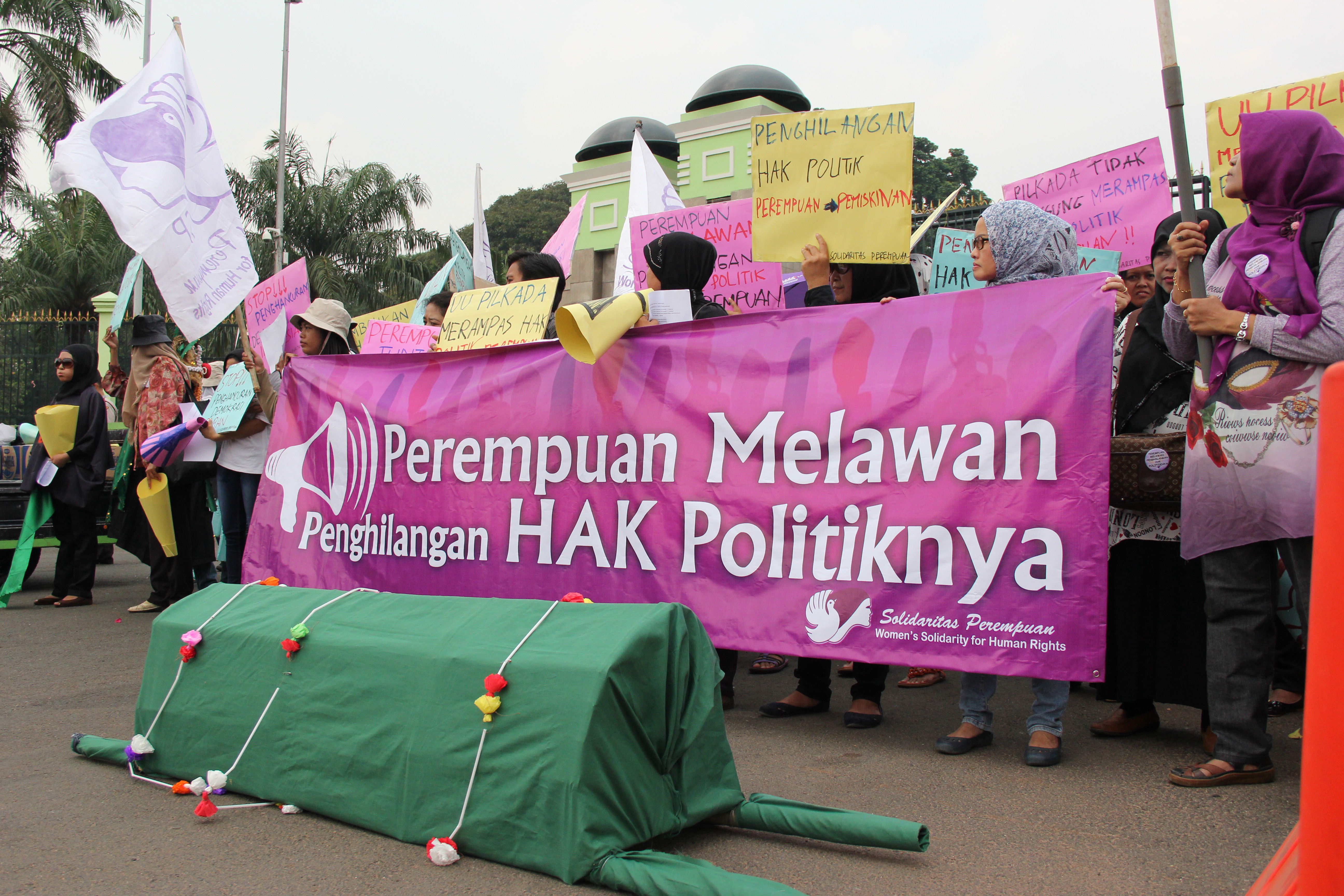Solidaritas Perempuan mencatat bahwa Jum’at (26/9) dini hari telah menjadi momentum dihilangkannya hak politik rakyat, perempuan dan laki-laki. Pengesahan RUU Pilkada saat ini merupakan ancaman serius bagi proses demokrasi di Indonesia, pasalnya UU Pilkada mengatur pemilihan kepala daerah diserahkan kepada DPRD sesuai dengan tingkatan masing-masing.