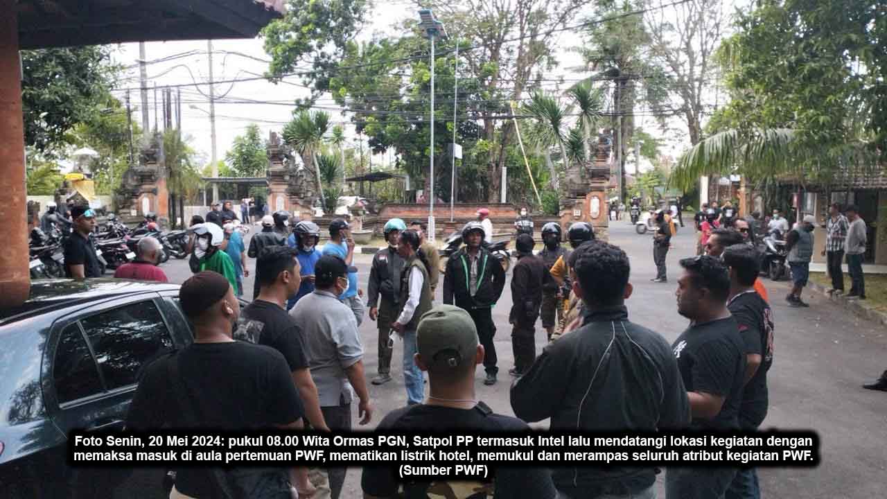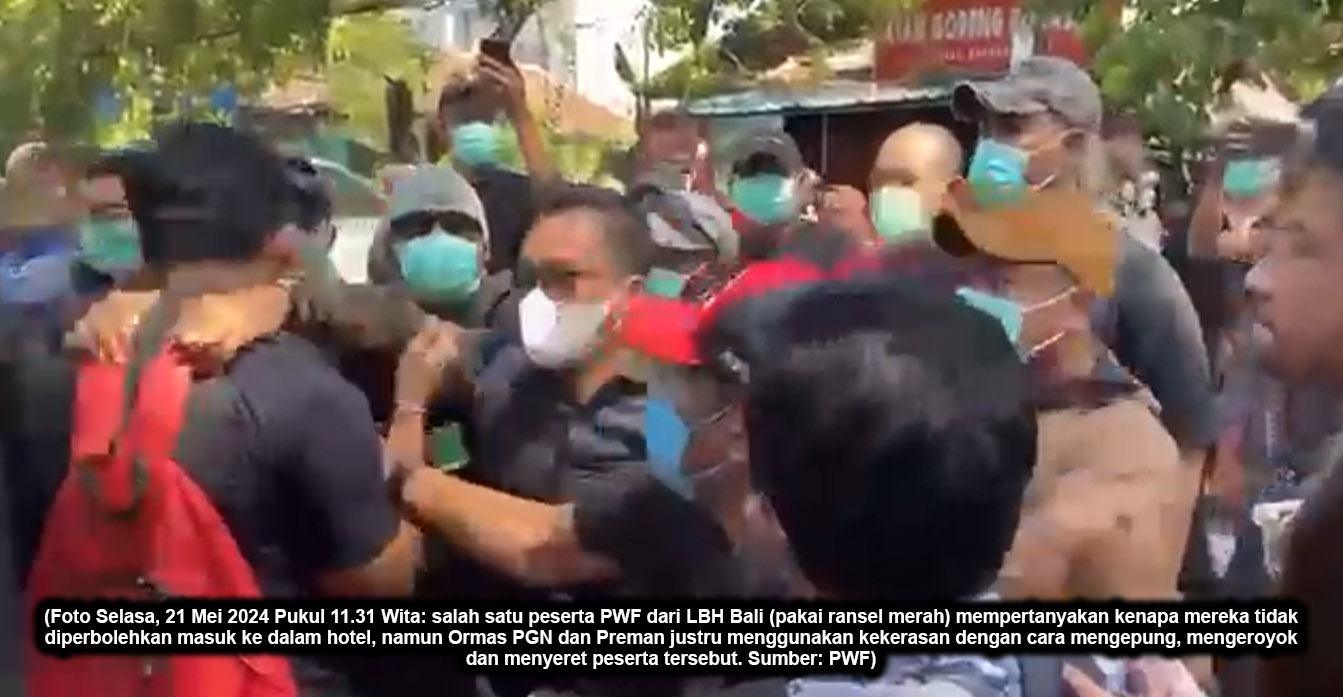 Demi menjamin kesuksesan perhelatan World Water Forum (WWF) ke-10 dari tanggal 18-25 Mei 2024 di Bali, Indonesia, kembali menjadi alasan pemerintah Indonesia untuk membungkam suara kritis rakyat yang memperjuangkan kedaulatan atas air, termasuk perlindungan dan pemenuhan hak atas air, dalam hal ini adalah People’s Water Forum (PWF). Di saat WWF berlangsung dengan pesta makan malam yang mewah, penuh dengan tarian dan nyanyian, menghasilkan kesepakatan investasi besar-besar masyarakat korban kasus perampasan sumber daya air dan pejuang hak atas air mengalami intimidasi, serangan dan kekerasan negara.
