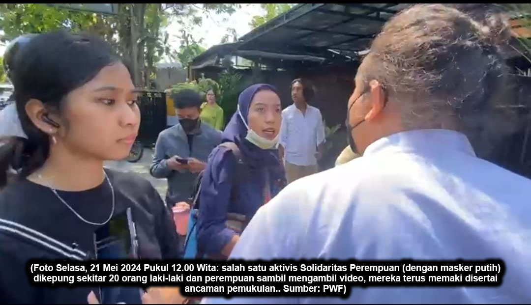 Sementara itu para peserta PWF yang berada di luar karena dilarang masuk, mengalami pelecehan seksual verbal. Keluar ucapan-ucapan melecehkan dengan gaya menggoyangkan tubuh bagian bawah di depan sejumlah aktivis perempuan, seperti “Berapa uang maharmu?”; “Berapa biayamu per malam” (sambil memperlihatkan barang-barang seperti jam tangan, topi dan sepatu yang menurutnya barang mewah); “Tinggi, cakep, pintar, berani, idaman mamaku banget, pasti jago di ranjang”; “Saya mau telepon mamaku, mau kasih lihat perempuan mana yang dipilih”; “Sekitar 6 orang aktivis Solidaritas Perempuan hampir diserempet oleh satu orang yang mengendarai motor, sambil melihat spion dan tersenyum”.